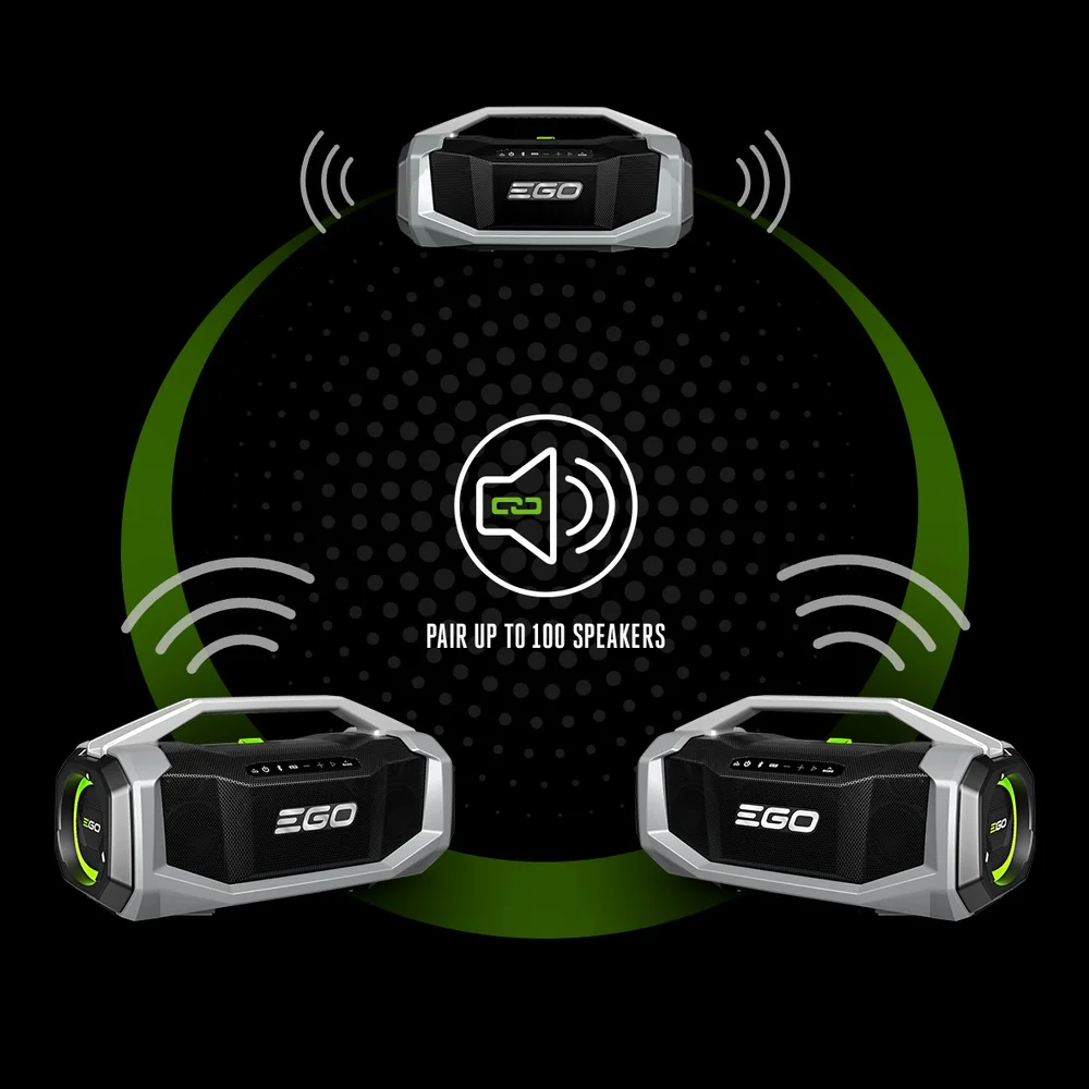 The EGO POWER+ 180W Bluetooth Speaker with True Wireless Stereo technology delivers powerful, premium sound performance from seven speakers including two mid-range, two tweeters, two passive radiators, and a subwoofer.