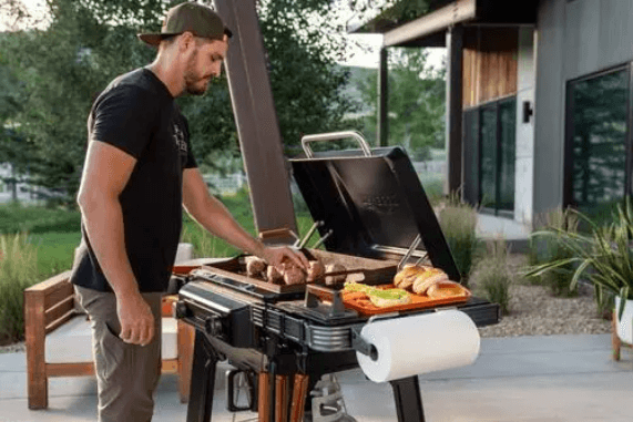 - Built-in folding shelves stay cool and offer extra space for prepping, plating, and more
