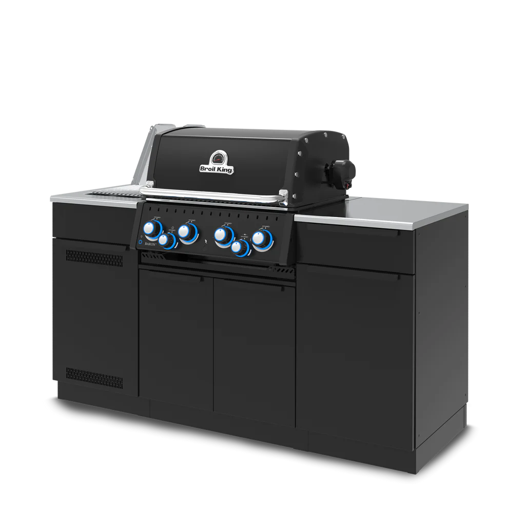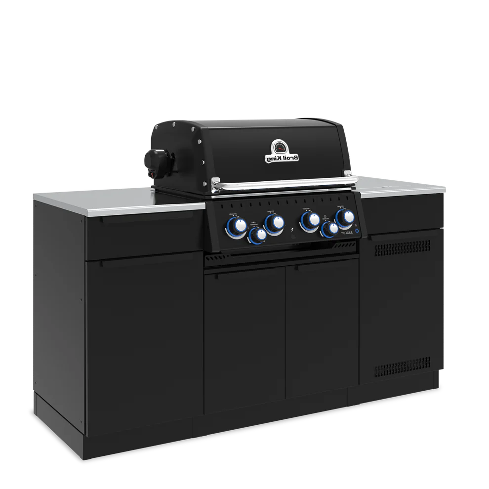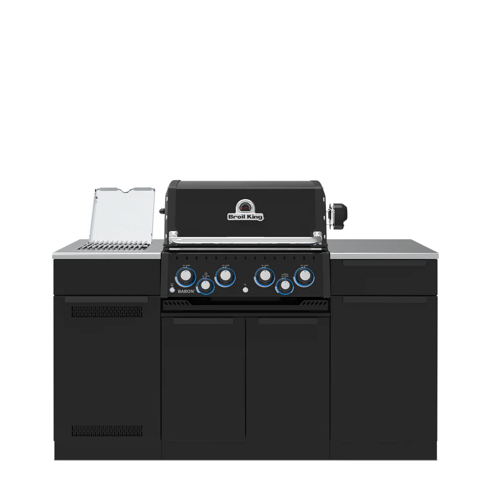 - Side Cabinets: Galvanized black painted steel side cabinets. A side burner