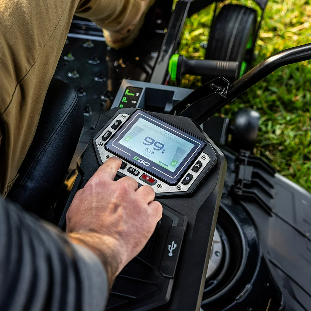 - Nouvel écran numérique couleur pour personnaliser votre tonte : vitesse, mode de conduite, vitesse de la lame, régulateur de vitesse et état de la batterie ; compatible avec l’application EGO Connect pour surveiller l’état de la batterie, le temps de charge et plus encore depuis votre fauteuil préféré.