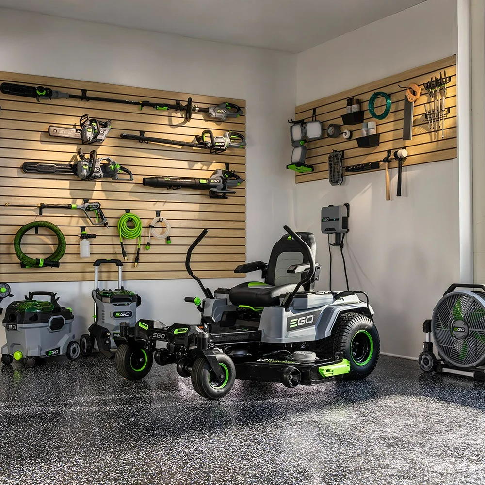 - La technologie Peak Power™ combine la puissance de six batteries EGO 56V ARC Lithium™ pour fournir une puissance équivalente à celle d'une tondeuse à rayon de braquage zéro équipée d'un moteur à essence de 27 chevaux.