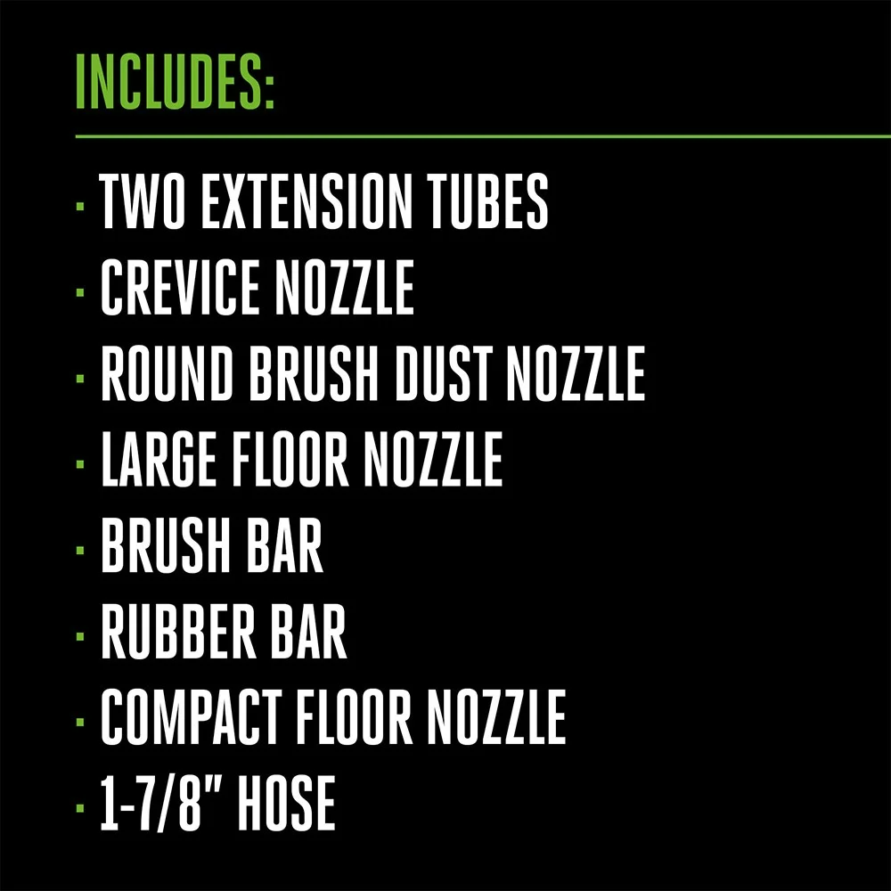 - Includes (2) extension tubes, crevice nozzle, round brush dust nozzle, large floor nozzle and brush bar, rubber bar, compact floor nozzle, 1-7/8-inch hose, remote control, charging cable for remote control, power tool adapter