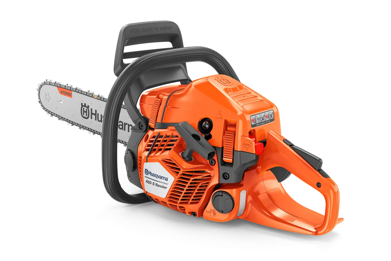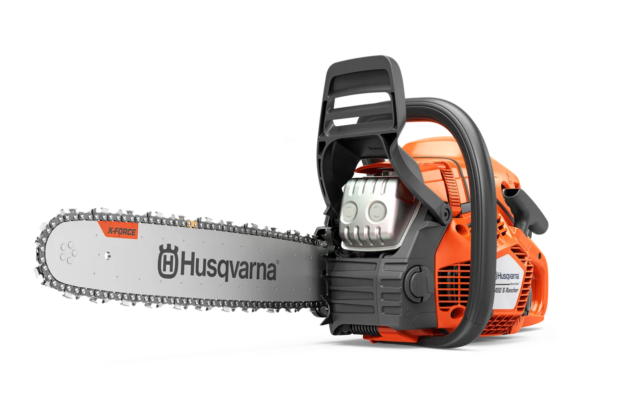 Husqvarna 450S is a landowner chainsaw designed to tackle everything from forestry tasks like felling, cutting, and limbing to cutting firewood. Based on the reliable 400 series, this light chainsaw boasts a reinforced, robust design to increase product lifetime. It is equipped with a powerful and optimized 2.4 kW X-Torq® engine for increased performance. The refined starting procedure is further improved by the Smart Start® feature. Additional features, such as colored felling marks and captured bar nut, enhance the overall experience.